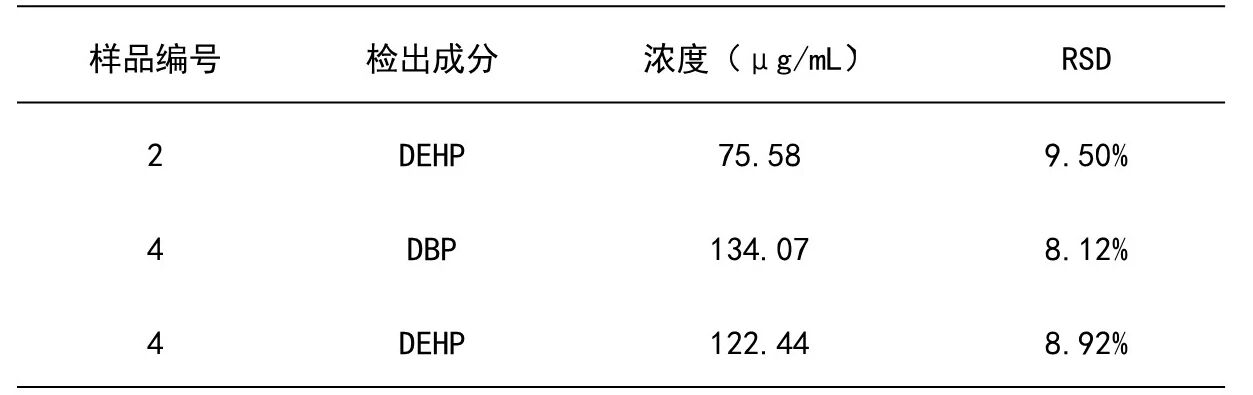 以上測試結(jié)果中,四種鄰苯二甲酸酯的6針重復(fù)性<1.3%,加標回收率在88%-99%之間,保留時間RSD<0.01%,滿足相關(guān)標準中鄰苯二甲酸酯檢測的要求。對實際樣品進行測試驗證,7種樣品中2、4號雖有檢出,檢出成分分別為DEHP、DBP,但均低于標準最低限量,為合格樣品。實際固體樣品的檢出重復(fù)性<10%。