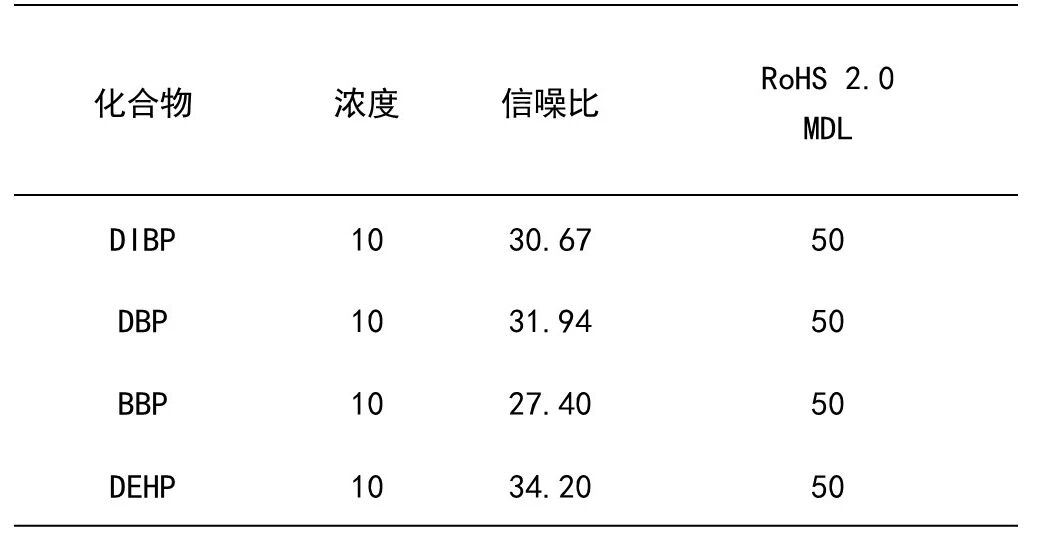 測試結(jié)果顯示,PRA600 RoHS 2.0快篩分析儀對四種鄰苯二甲酸酯的檢出限低于最低檢出限50μg/mL,完全滿足標準要求。