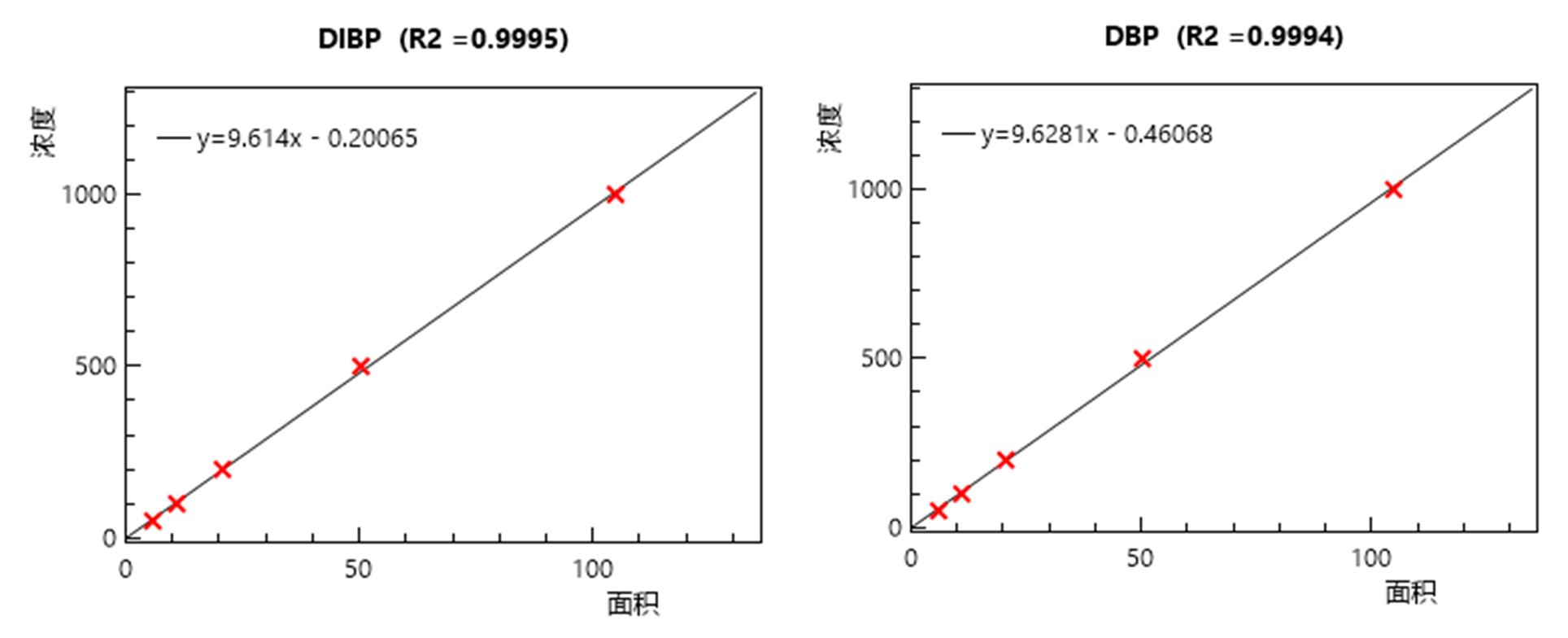 將標準使用液分別配制為50、100、200、500、1000μg/mL的標準溶液,從低濃度到高濃度依次上機分析,記錄目標化合物的保留時間和響應(yīng)值。