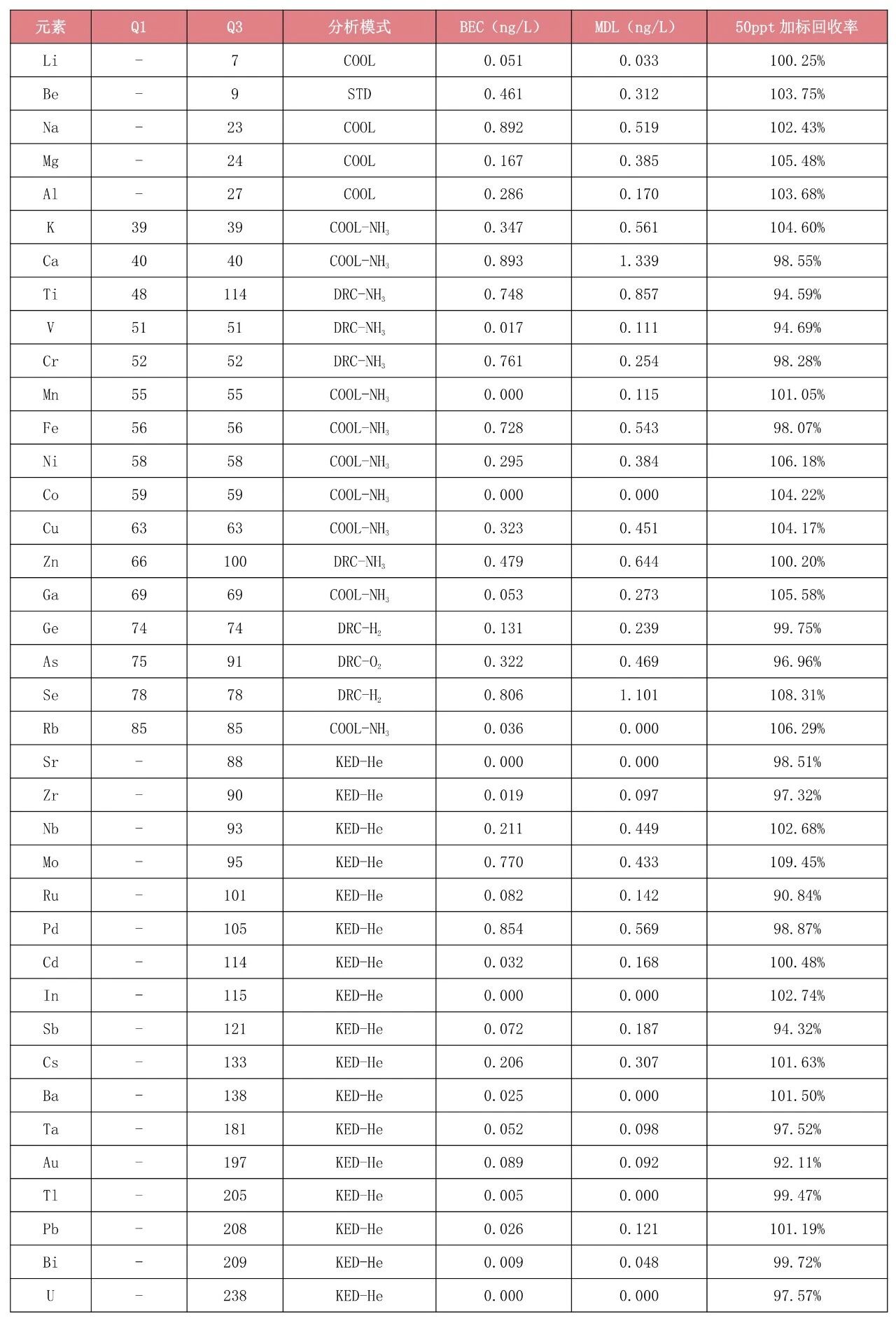 LabMS 5000具有多種干擾消除模式,可根據(jù)不同應(yīng)用需求靈活選擇,針對(duì)不同元素優(yōu)化最適宜的分析模式。在一個(gè)方法中使用7種分析模式測(cè)試9.8%硫酸中38 種痕量雜質(zhì)元素,背景等效濃度(BEC)在ppt及亞ppt級(jí)別,50ppt加標(biāo)樣品回收率在90%~110%之間,驗(yàn)證了儀器能夠準(zhǔn)確測(cè)定高純硫酸中痕量雜質(zhì)元素含量。