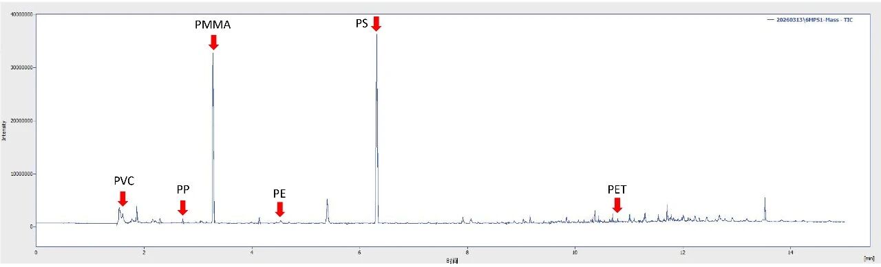 稱取5g土壤為樣品,進(jìn)行前處理,高溫高壓的溶劑萃取,再進(jìn)行濃縮至1mL,取20μL進(jìn)行PY-GC-MS分析,樣品中檢出PS 25mg/kg,PP 14mg/kg ,其它塑料未檢出。