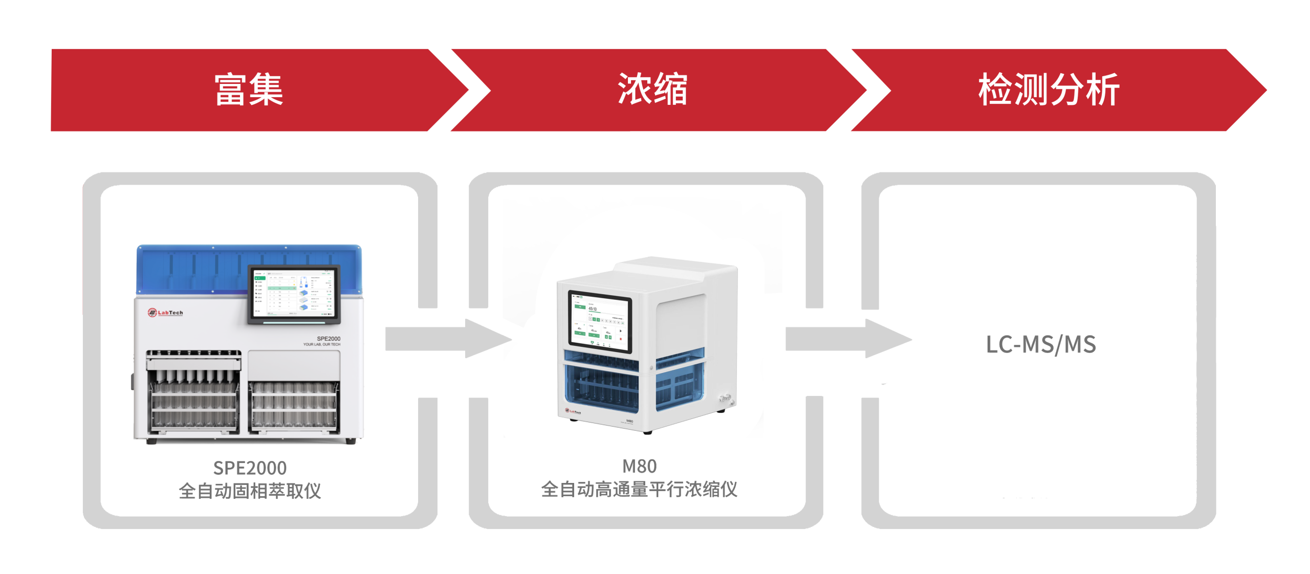 核心邏輯:采用 SPE2000 全自動固相萃取儀完成大體積水樣的富集凈化,配合 M80 全自動高通量平行濃縮儀進(jìn)行批量濃縮,最后通過液質(zhì)聯(lián)用(LC-MS/MS)檢測。