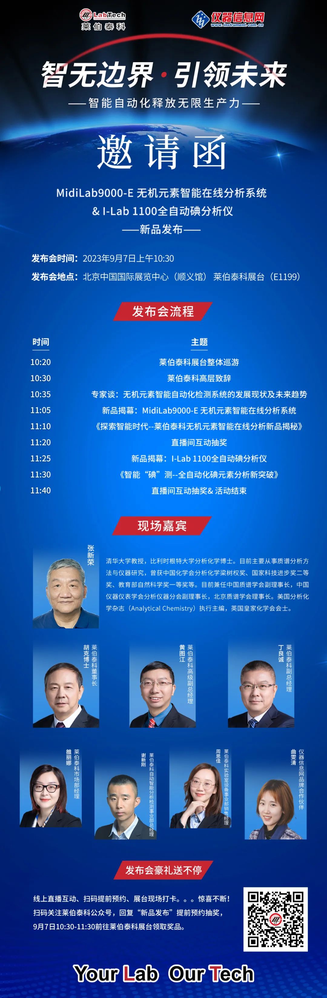 萊伯泰科即將于2023 BCEIA展會(huì)期間舉辦“智無(wú)邊界 引領(lǐng)未來(lái)--智能自動(dòng)化釋放無(wú)限生產(chǎn)力”無(wú)機(jī)元素智能自動(dòng)化分析新品發(fā)布會(huì),發(fā)布萊伯泰科的兩款最新產(chǎn)品:MidiLab9000-E無(wú)機(jī)元素智能在線分析系統(tǒng)和I-Lab 1100全自動(dòng)碘分析儀。