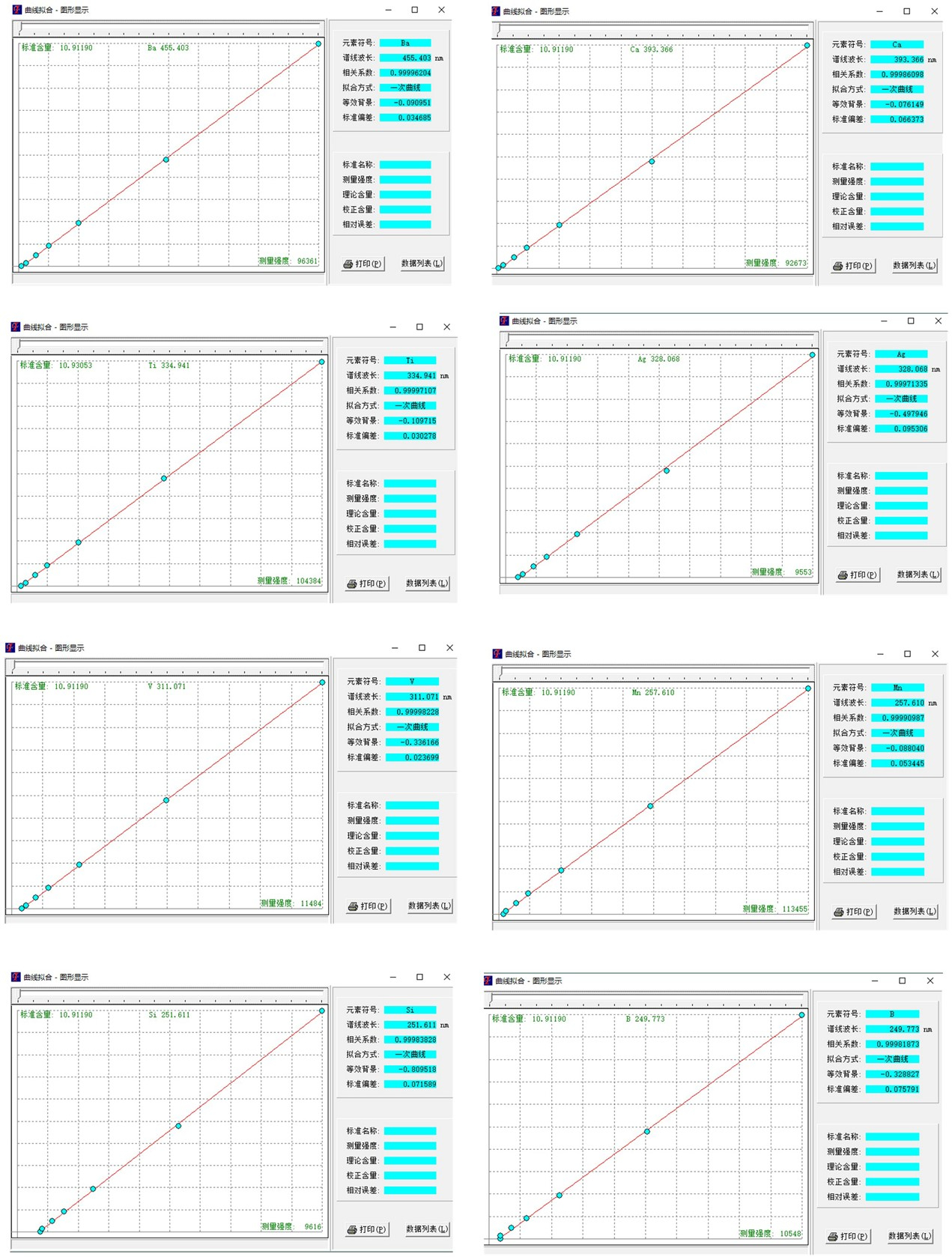 圖2 部分元素標(biāo)準(zhǔn)曲線