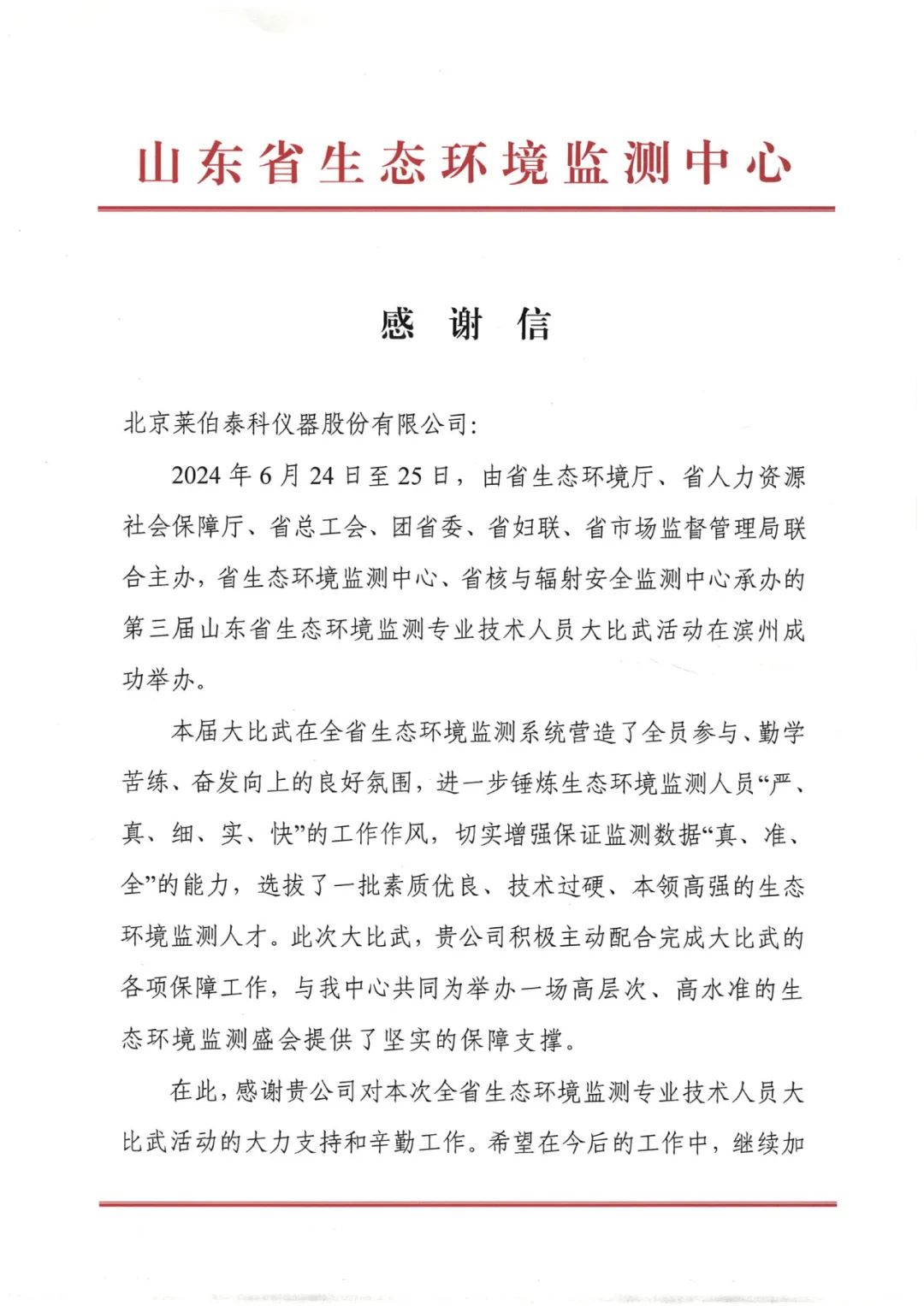在本次活動(dòng)中,萊伯泰科大力支持,憑借杰出的貢獻(xiàn)贏得了山東省環(huán)境監(jiān)測(cè)中心的高度認(rèn)可與誠(chéng)摯感謝,共同見證了活動(dòng)的圓滿成功!