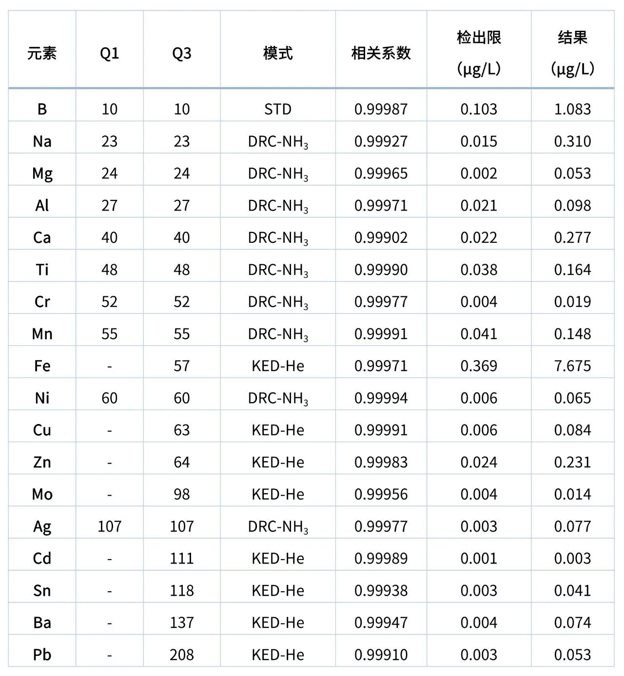 檢測結(jié)果所示,待測元素的標(biāo)準(zhǔn)曲線相關(guān)系數(shù)均大于 0.999,線性良好,滿足痕量元素定量分析的基本要求;背景等效濃度(BEC)與檢出限(DL)處于極低水平,其中 Cd、Cr、Mo、Ag 等元素檢出限低至 0.001~0.004 μg/L,Na、Mg、Ni 等關(guān)鍵催化劑毒物檢出限也均低于 0.022 μg/L。