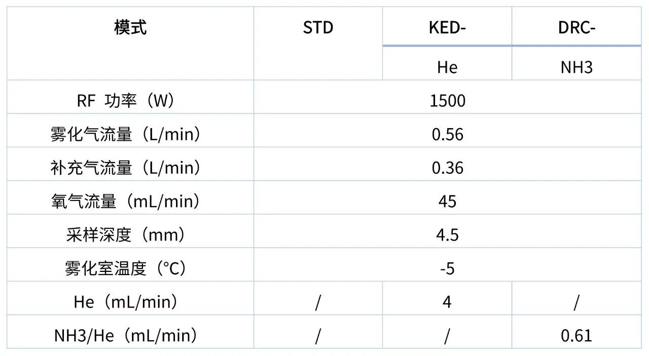 LabMS 5000 ICP-MS/MS配備石英霧化器、帶有控溫附件的石英霧化室、石英炬管及中心管、Pt采樣錐和截取錐。在本實驗中,采用多種碰撞反應(yīng)池氣體(He、NH3)。詳細(xì)儀器參數(shù)如表1所示。