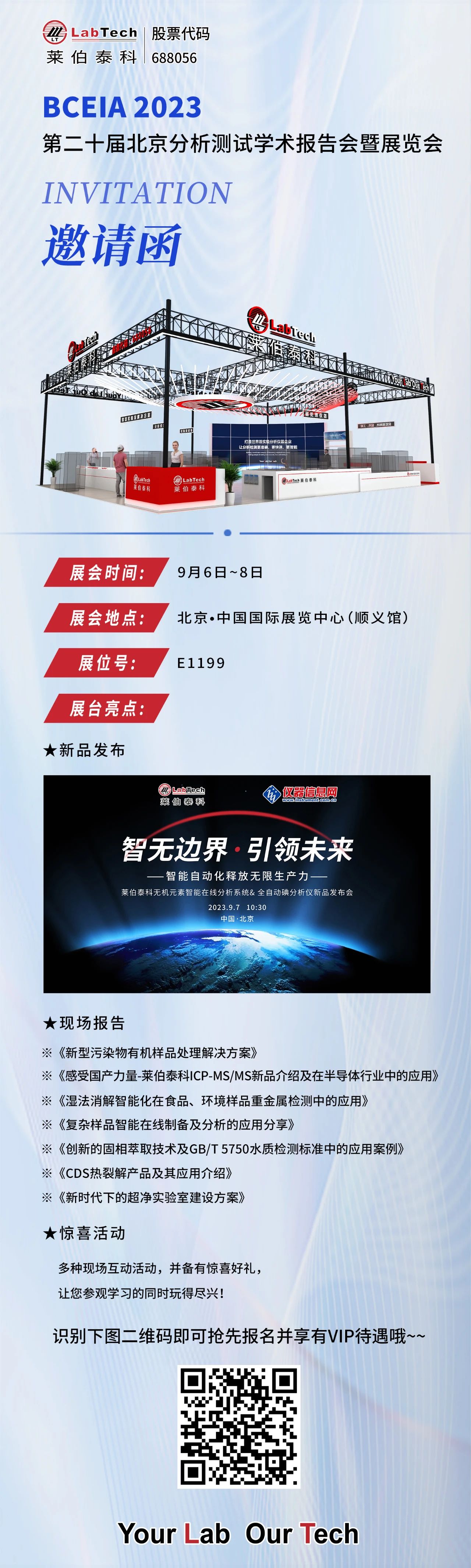 2023年9月6日,第二十屆北京分析測試學(xué)術(shù)報告會暨展覽會(BCEIA 2023)即將盛大開幕。今年,是萊伯泰科第十一次參加BCEIA盛會,萊伯泰科將以更加飽滿的活力和激情,攜全線產(chǎn)品亮相本次展會,期間更有重磅新品現(xiàn)場發(fā)布,讓您親身體驗萊伯泰科最新的科技成果和產(chǎn)品創(chuàng)新。