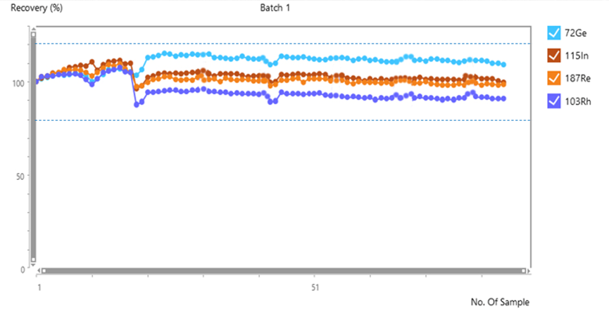 土壤基體與標(biāo)曲基體差異較大,ICP-MS在分析土壤樣品時(shí)內(nèi)標(biāo)元素容易漂移,而內(nèi)標(biāo)穩(wěn)定性是儀器分析的關(guān)鍵。LabMS 3000在3小時(shí)內(nèi)連續(xù)分析70份土壤樣品,內(nèi)標(biāo)穩(wěn)定在80%-120%之間,證明了儀器具有良好的基體耐受性和檢測(cè)穩(wěn)定性,保證分析效率和數(shù)據(jù)質(zhì)量。