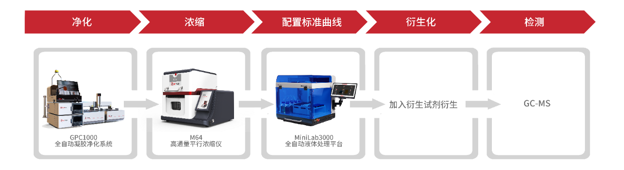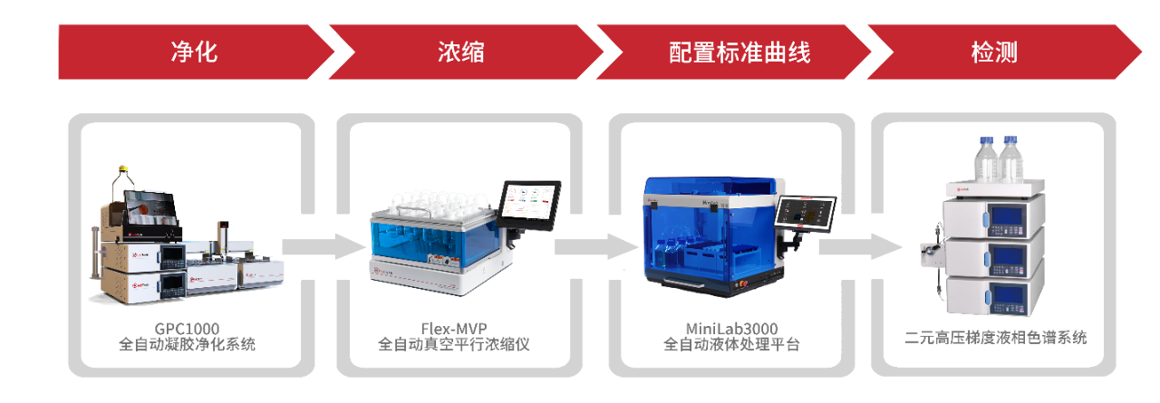該方案可以實現(xiàn)自動化、高通量的提取、凈化,有效避免和減少有機(jī)試劑對分析人員造成的健康危害,減少人員用量、減少人為誤差,方法準(zhǔn)確性好、精密度高、可以實現(xiàn)高通量自動化的檢測。