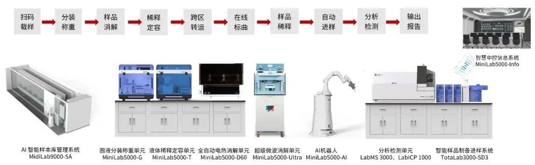 MidiLab9000-E無機元素在線分析系統(tǒng)集成智能化樣本庫管理、分裝稱重、全自動消解、稀釋定容,與質(zhì)譜、光譜分析方法相結(jié)合,通過小萊AI機器人,完成待測樣品的轉(zhuǎn)運,實現(xiàn)從樣品管理到分析檢測全流程自動化。