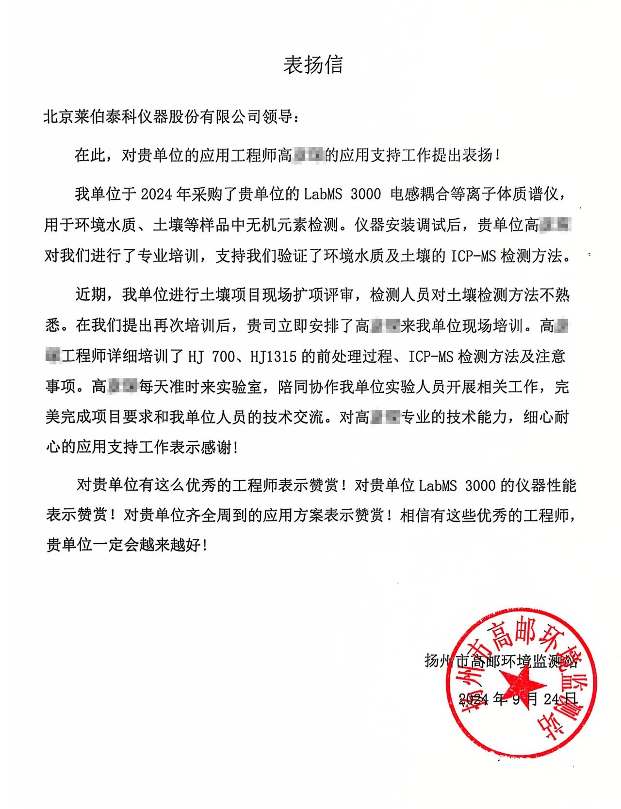 產(chǎn)品優(yōu)異,服務(wù)貼心,口碑自然來!近日,萊伯泰科憑借其細致入微且高度專業(yè)的售后服務(wù),再次贏得了客戶的廣泛贊譽。公司相繼收到了中國科學(xué)技術(shù)大學(xué)人文學(xué)院及揚州市高郵環(huán)境監(jiān)測站專門針對ICP-MS工程師的感謝信,這不僅是對工程師們專業(yè)度的由衷認可,更是對萊伯泰科“以客戶為中心”服務(wù)理念的高度贊揚與肯定。