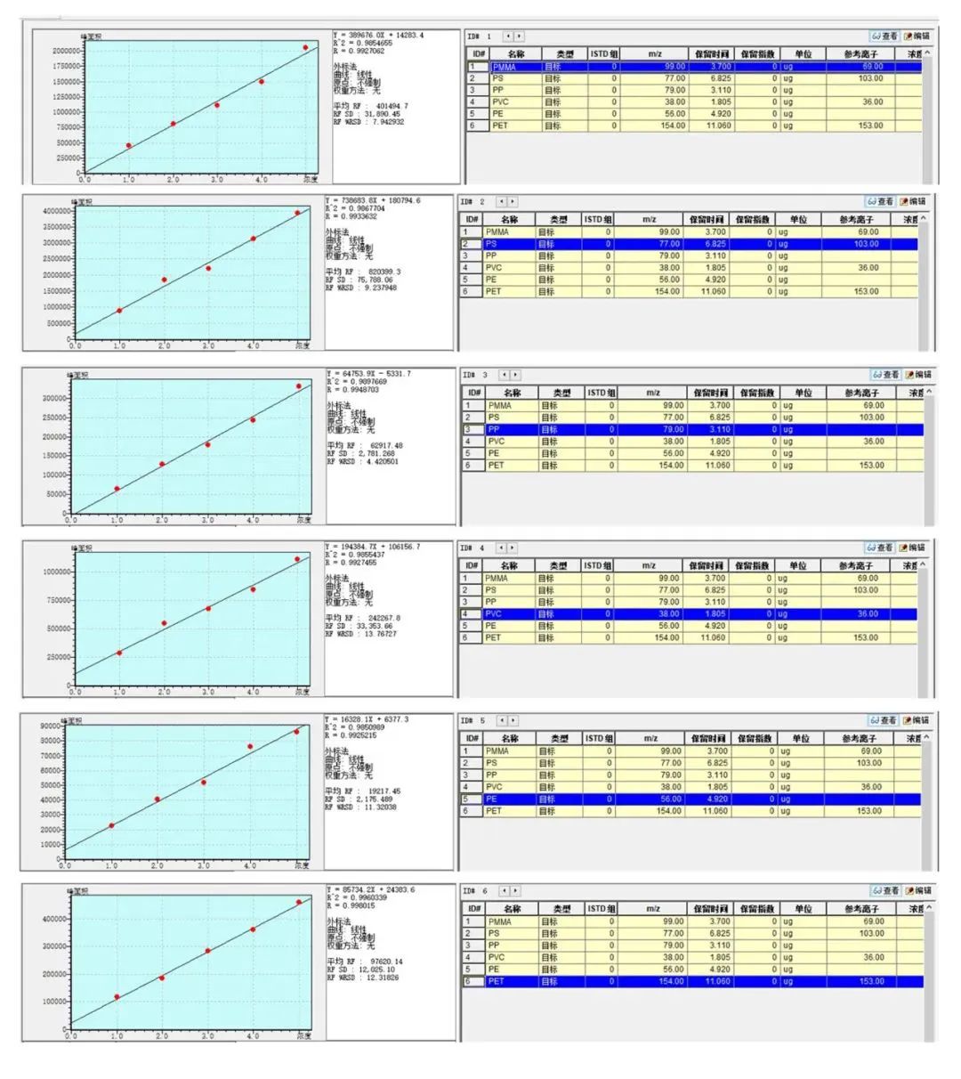 塑料高溫高壓在有機溶劑萃取后,仍然不是溶液狀態(tài),實際是懸濁液,只是塑料的顆粒極其小,在充分晃動后,6種微塑料顆粒在溶劑中能均勻分散。則盡量取大體積進樣,則分析穩(wěn)定性會更好。CDS Pyroprobe6150的樣品管為20μL ,取滿1個樣品管為1μg,則可反復蒸發(fā)干和再加入方式,可分別取1~5管,則為1μg、2μg、3μg、4μg、5μg 。