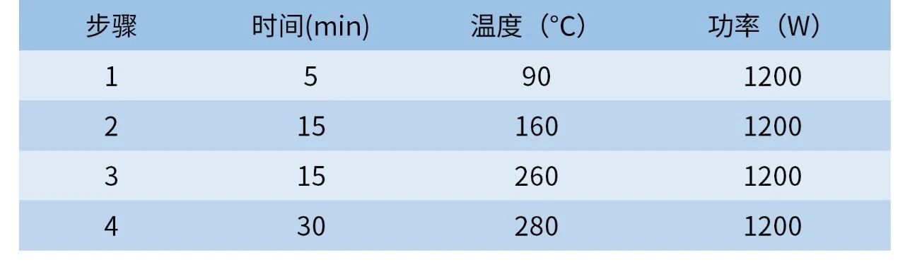 準(zhǔn)確稱取0.1g左右樣品(精確至0.0001g)放入干燥潔凈的石英管中,至于支架上;每根管子分別添加4mL硝酸及適量氧化劑;蓋上樣品管蓋后,將支架放入已添加載液(150mL純水,5mL硫酸)的內(nèi)襯筒中,預(yù)加壓;按照表1中升溫程序進(jìn)行消解。程序運(yùn)行完畢后,冷卻取出,打開罐蓋,取出樣品,擦干儀器。