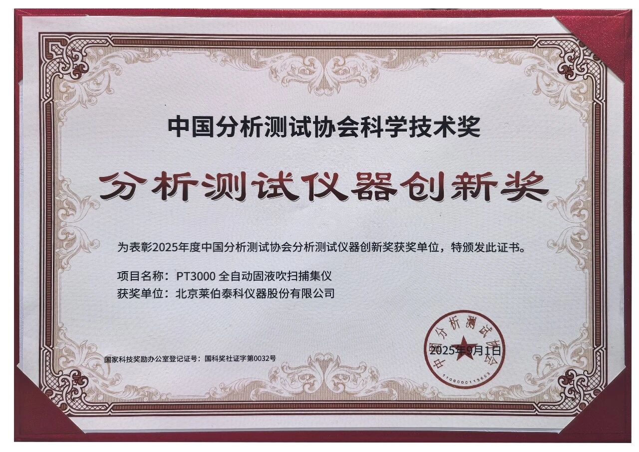 近日,萊伯泰科自主研發(fā)生產(chǎn)的PT3000全自動(dòng)固液吹掃捕集儀,成功斬獲由中國(guó)分析測(cè)試協(xié)會(huì)頒發(fā)的“分析測(cè)試儀器創(chuàng)新獎(jiǎng)”(原BCEIA金獎(jiǎng))!這一獎(jiǎng)項(xiàng)經(jīng)國(guó)家科技獎(jiǎng)勵(lì)辦公室備案,是我國(guó)分析測(cè)試領(lǐng)域技術(shù)創(chuàng)新成果的核心認(rèn)可標(biāo)志,代表著該領(lǐng)域技術(shù)研發(fā)的高水平方向。此次獲獎(jiǎng),不僅是對(duì)PT3000儀器性能的高度肯定,更彰顯了萊伯泰科在實(shí)驗(yàn)室分析儀器領(lǐng)域的硬核技術(shù)實(shí)力。