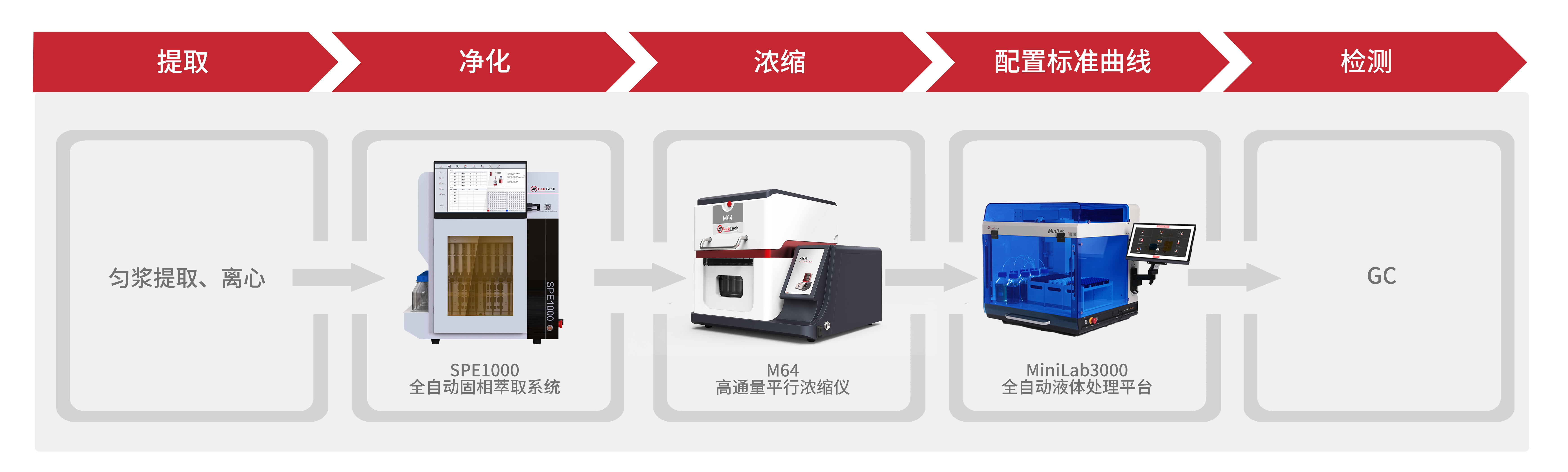 本方案參考標準《GB 23200.8-2016 食品安全國家標準 水果和蔬菜中500種農(nóng)藥及相關(guān)化學(xué)品殘留量的測定 氣相色譜-質(zhì)譜法》來進行相關(guān)實驗的分析。使用了萊伯泰科SPE1000全自動固相萃取系統(tǒng)提取大蔥中的 11種有機磷,M64 高通量平行濃縮儀濃縮后氣相色譜儀進行檢測的一整套方法。