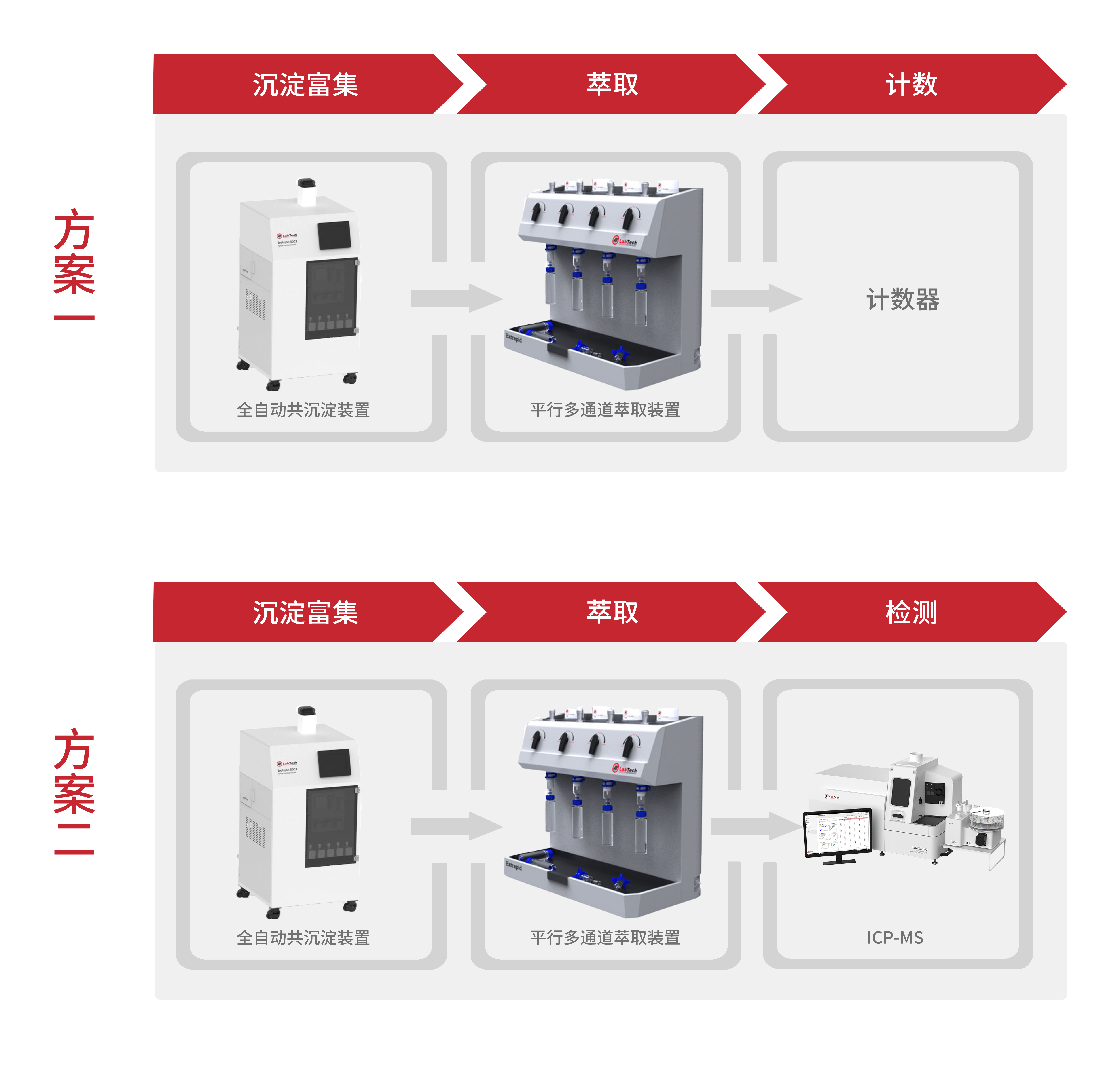 該方案使用了全自動共沉淀裝置Isotope-50C1、平行多通道萃取裝置、ICP-MS,或根據(jù)各戶需要提供各種不同的方案,該產(chǎn)品由我公司自主研發(fā)設(shè)計。有效提高了樣品通量,降低了人工與耗材的成本,結(jié)合ICP-MS或計數(shù)器等后續(xù)分析儀器檢測,實現(xiàn)放射性鍶快速分離、制樣、檢測、結(jié)果報告的集成化和自動化。